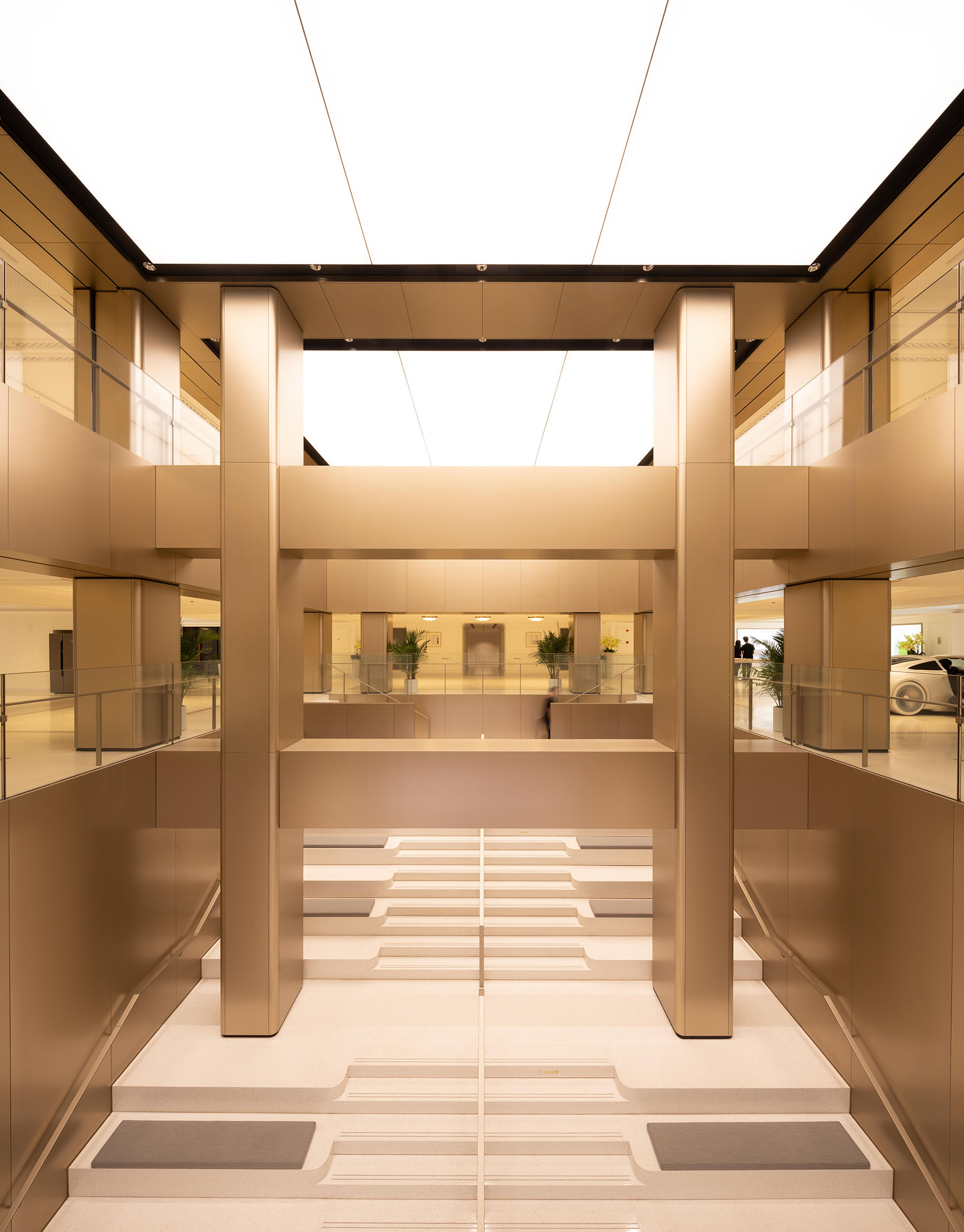 墻面地面一體化金磨石運(yùn)用,使室內(nèi)整體感大幅度提升,金磨石光滑平整的優(yōu)點(diǎn)在中庭燈光的映襯下得到完美體現(xiàn)