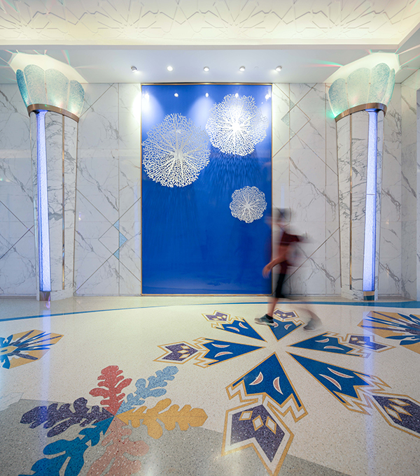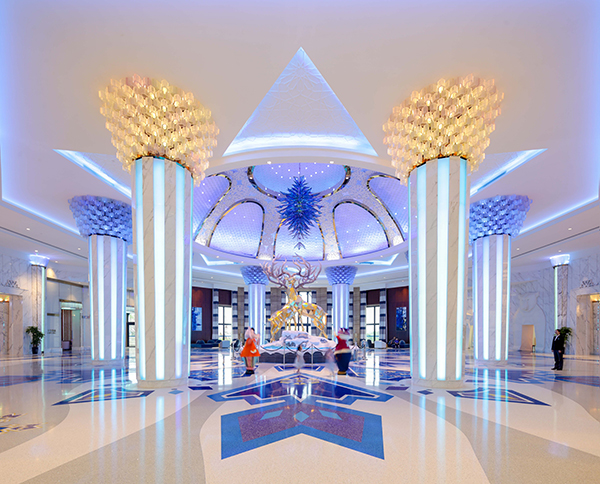 銀基冰雪酒店作為夏日度假酒店,“冰雪”是主打的特色大堂作為整個(gè)酒店的亮點(diǎn),以藍(lán)色為主基調(diào),配合地面五彩雪花圖案