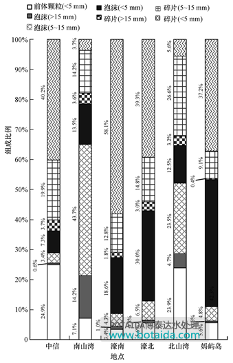 另外,不同尺寸級別的塑料垃圾數(shù)量比例也存在差異(圖 1).除南山灣和北山灣以外,其余4個沙灘中微型塑料總數(shù)所占比例都較高(高于70%),北山灣和南山灣的塑料垃圾中占比最大的尺寸主要集中在5~15 mm(占比均高于50%),且以泡沫為主.北山灣和中信北部沙灘上的中型塑料碎片(5~15 mm)比例較高,這些都可能成為該地區(qū)后期微型塑料污染的潛在來源.