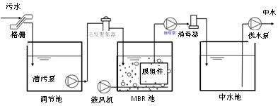 膜生物反應器(Membrane Bio-Reactor,MBR)是一種由膜分離單元與生物處理單元相結(jié)合的新型水處理技術(shù),以膜組件取代二沉池,在生物反應器中保持高活性污泥濃度,減少污水處理設施占地,并通過保持低污泥負荷減少污泥量。該工藝主要利用沉浸于好氧生物池內(nèi)的膜分離設備,截留槽內(nèi)的活性污泥與大分子有機物。膜生物反應器系統(tǒng)內(nèi)活性污泥濃度可達到8000-10000mg/L,污泥齡達到30天以上。膜生物反應器因其有效的截留作用,可保留世代周期較長的微生物,如硝化菌,系統(tǒng)內(nèi)其硝化效果明顯,對深度除磷脫氮提供可能。MBR工藝基本構(gòu)造如圖4所示。