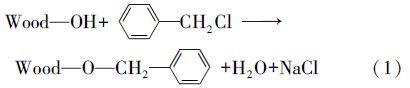 參照文獻(xiàn)(王東華等,2000)方法,在帶有攪拌機(jī)、溫度計(jì)和回流裝置的250 mL三口燒瓶中,加入20.0 g脫脂杉木粉和10% NaOH水溶液80~120 mL,攪拌均勻后讓其潤脹 30 min,然后加入 80~120 mL氯化芐和80 mL甲苯,攪拌下于110 ℃ 油浴中加熱反應(yīng)到設(shè)定時間,冷卻并加入少量水,抽濾,分別用50 mL 50%乙醇洗滌兩次,100 mL水洗滌兩次,再用50 mL 95%乙醇洗滌兩次,抽干,在60 ℃下干燥至恒重,得芐基化杉木粉,簡稱“芐基化木粉”,轉(zhuǎn)入干燥器中,并計(jì)算增重百分率(WPG).木粉芐基化改性的化學(xué)反應(yīng)式如下: