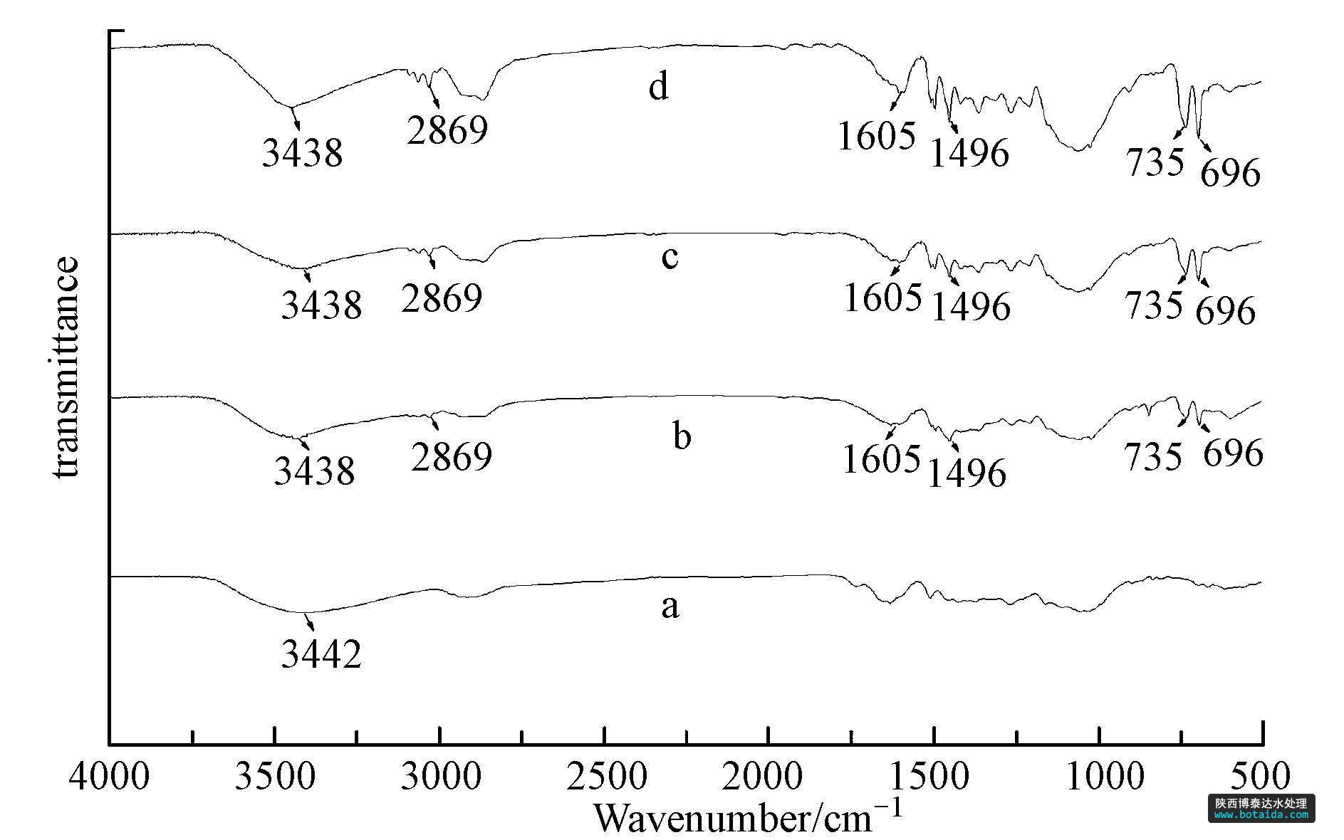 分析 采用Nicolet Avatar-330紅外光譜儀對脫脂木粉、芐基化木粉、多微孔芐基化木粉和吸附后的多微孔芐基化木粉進(jìn)行了表征(圖 1).對比原木粉(圖 1a)和芐基化木粉(圖 1b)的紅外光譜圖發(fā)現(xiàn),原木粉經(jīng)芐基化改性后,羥基振動吸收峰由3442 cm-1移向3438 cm-1,在1605 cm-1、1496 cm-1處的兩重峰及735 cm-1、696 cm-1處的強(qiáng)吸收峰均顯示單取代苯環(huán)的特征吸收.另外,2868 cm-1處出現(xiàn)的振動吸收峰表明了木材中的部分羥基已經(jīng)被芐基所取代.對比芐基化木粉(圖 1b)和多微孔芐基化木粉(圖 1c)的紅外光譜圖發(fā)現(xiàn),圖譜形態(tài)變化不大,無新的官能團(tuán)吸收峰出現(xiàn),表明芐基化木粉經(jīng)水熱處理后,木粉的化學(xué)組成沒有發(fā)生明顯變化.對比多微孔芐基化木粉(圖 1c)與吸附后的多微孔芐基化木粉(圖 1d)的紅外光譜圖,發(fā)現(xiàn)其吸收峰的波數(shù)基本一致,表明吸附對木粉的化學(xué)組成沒有產(chǎn)生明顯影響.