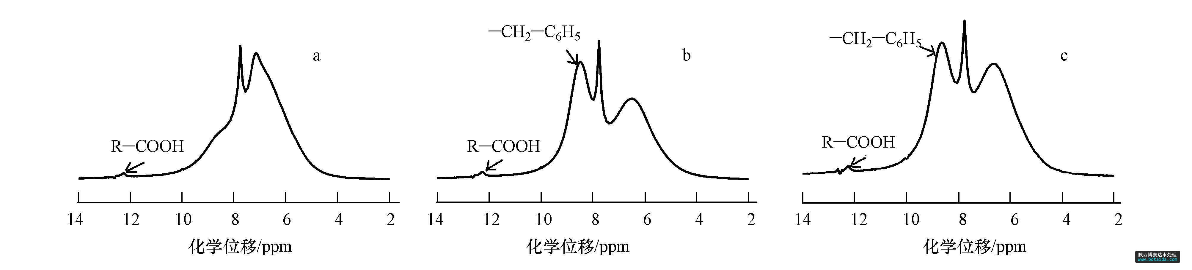 NMR)和碳譜(13C NMR)分析 用德國Bruker公司的600 MHz核磁共振儀對脫脂木粉、芐基化木粉和多微孔芐基化木粉的核磁共振氫譜(圖 2)和碳譜(圖 3)進(jìn)行了表征.從1H NMR圖譜來看,脫脂木粉1H NMR圖譜(圖 2a)、芐基化木粉1H NMR圖譜(圖 2b)和多微孔芐基化木粉1H NMR圖譜(圖 2c)在12.2 ppm處均存在酸類(R—COOH)的氫峰;在6.0~9.0 ppm范圍內(nèi),芐基化木粉和多微孔芐基化木粉在8.5 ppm處比脫脂木粉多出一個強(qiáng)信號峰,該峰為芐基苯的苯環(huán)C—H振動吸收峰,表明杉木粉的芐基化改性是成功的.同時,脫脂木粉的那個尖銳峰與芐基化木粉的那個尖峰的峰型和化學(xué)位移(7.7 ppm)基本一致;而另外一個大峰明顯變小,且化學(xué)位移由7.0 ppm移向6.5 ppm.對比芐基化木粉1H NMR圖譜(圖 2b)和多微孔芐基化木粉的1H NMR圖譜(圖 2c),峰的形態(tài)和化學(xué)位移基本未變,但個別峰略有改變,這可能是水蒸氣的爆破處理在一定程度上改變了木材纖維結(jié)晶區(qū)中原有締合氫鍵的排列.