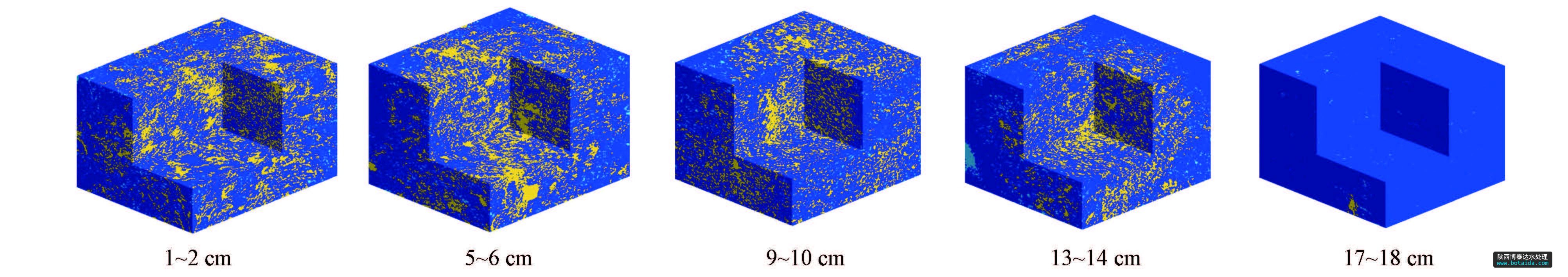 通過Mathematics軟件顯示沉積物不同深度樣品三維孔隙結(jié)構(gòu),如圖 4所示,圖中深藍色部分為沉積物基質(zhì),黃色部分為連通孔,淺藍部分為孤立孔.隨后利用Rwalk程序?qū)αW釉谧杂煽臻g與沉積物孔隙中的擴散進行隨機行走模擬,計算曲率.