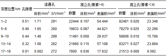 表3 巢湖W1點不同深度沉積物孔隙群統(tǒng)計表(3.375 mm3,250×250×250像素)