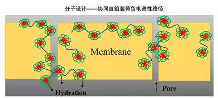 通過分子設計,采用雙荷負電(兩親)嵌段共聚物自組裝形成的豐富而有序的拓撲結構,對常規(guī)UF膜進行協(xié)同自組裝荷負電改性,最終制得高度有序的不對稱均孔荷負電功能超濾膜。
